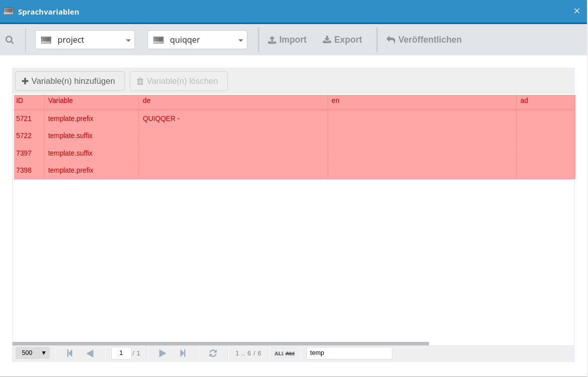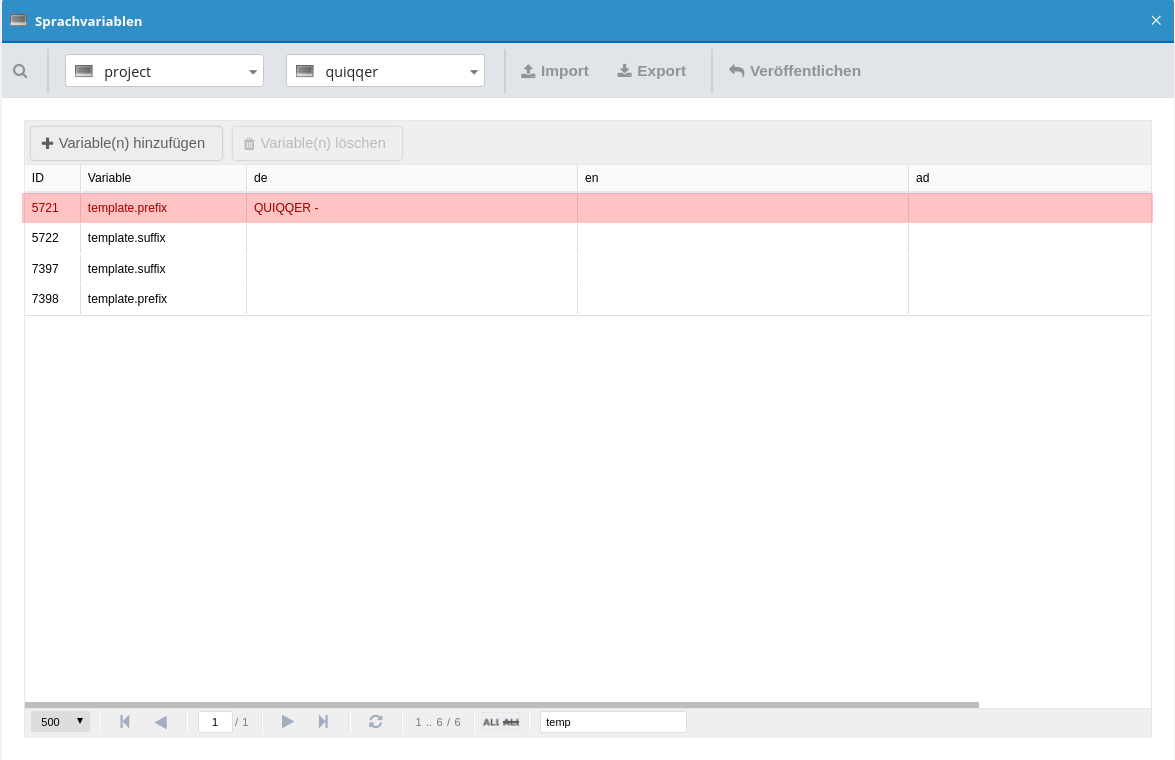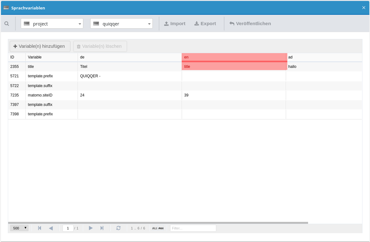 Hast du die gewünschte Gruppe ausgewählt, kannst du nun neue Variablen, die du übersetzen möchtest hinzufügen und vorhandene übersetzen.