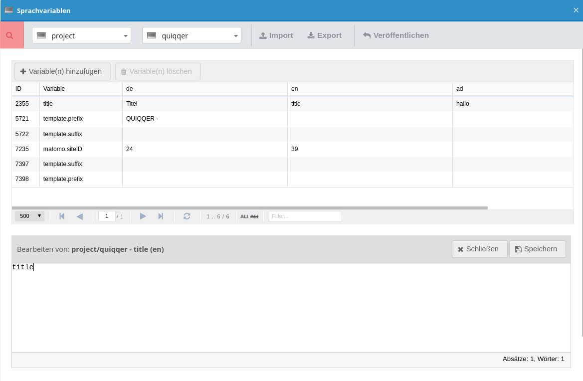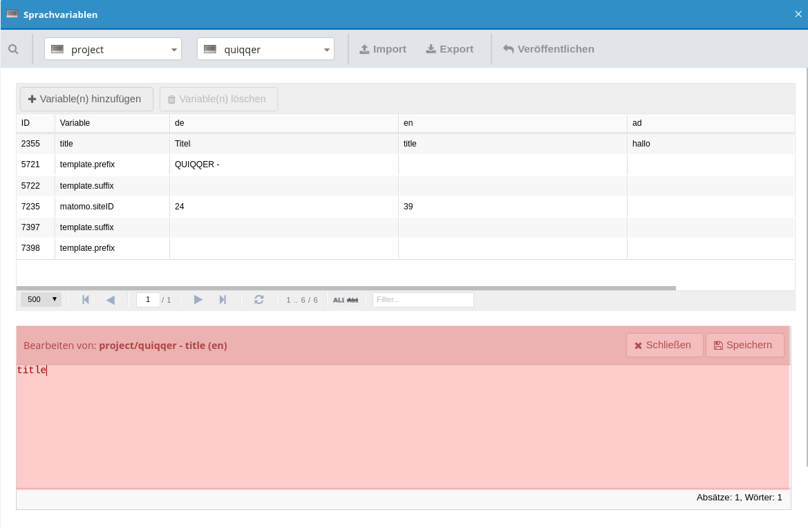 Bsp: Du möchtest eine neu hinzugefügte Variable editieren. Klicke zunächst auf die Spalte der Sprache (z. B. de) und schreibe den Text in das Feld, der an dieser Stelle angezeigt werden soll.
