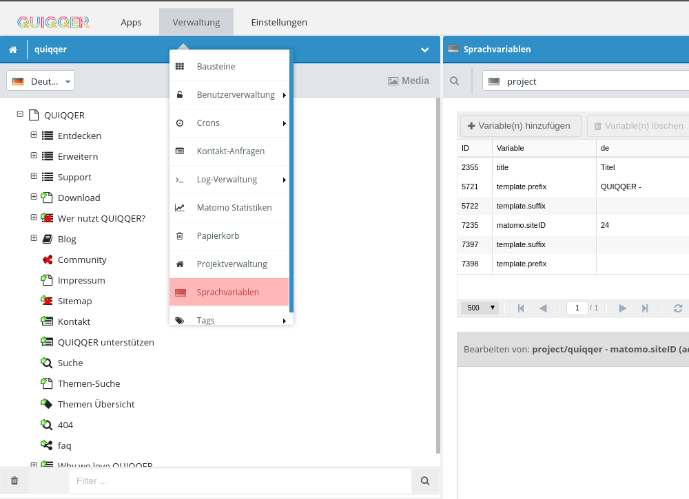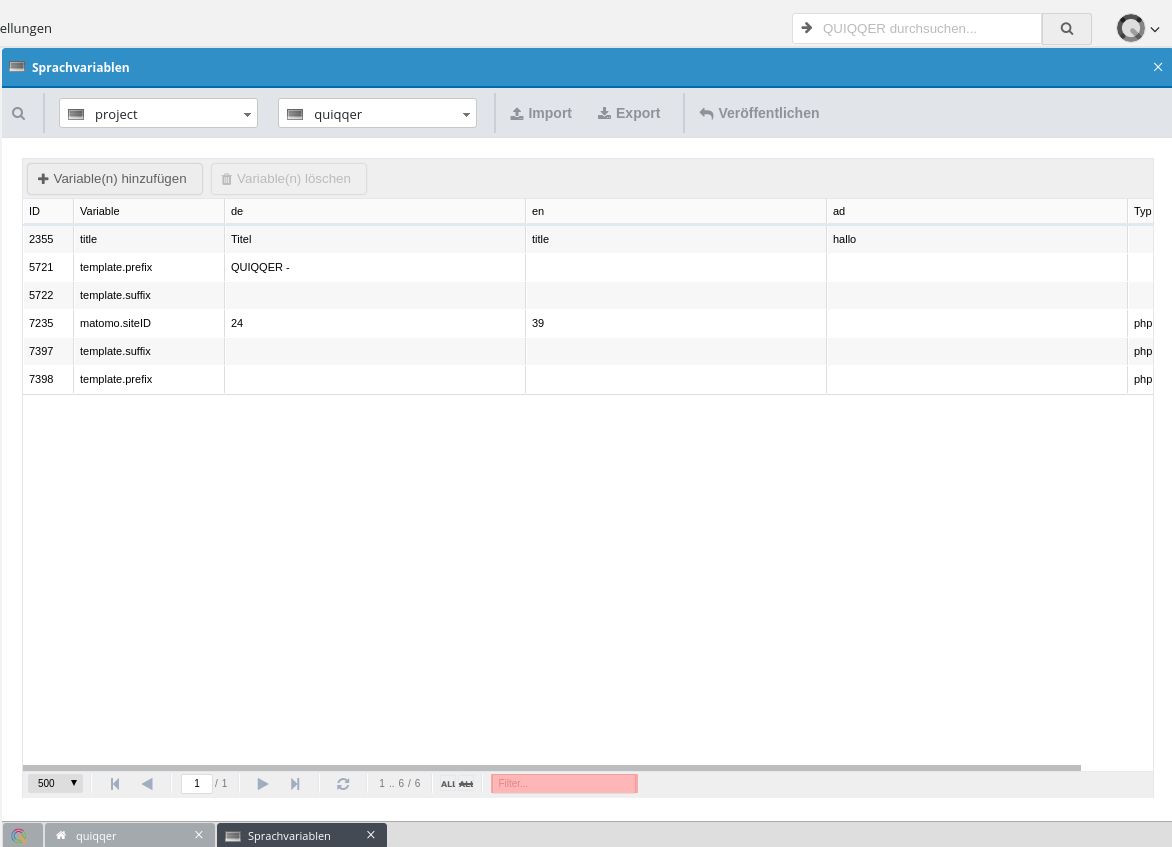 Navigiere im QUIQQER Menü über die Verwaltung zu den Sprachvariablen. Dort hast du oben die Möglichkeit in die verschiedenen Variablen-Gruppen zu wechseln.